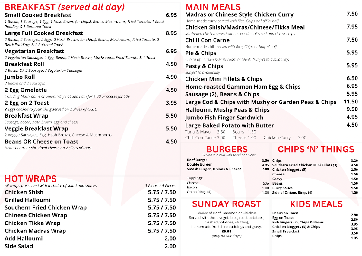 Taff Caff offers a fantastic selection of menu items that cater to all tastes and preferences. Start your day off right with their hearty breakfast options, featuring everything from classic fried eggs to a delightful kids' menu complete with Beans on Toast and Fish Fingers. Don’t miss out on their signature rolls like Tuna Mayo and Beef Salad, perfect for a quick lunch that doesn't compromise on flavor. And for your caffeine fix, the cafe serves an impressive range of hot drinks, including creamy Lattes and rich mochas that are sure to warm you up.